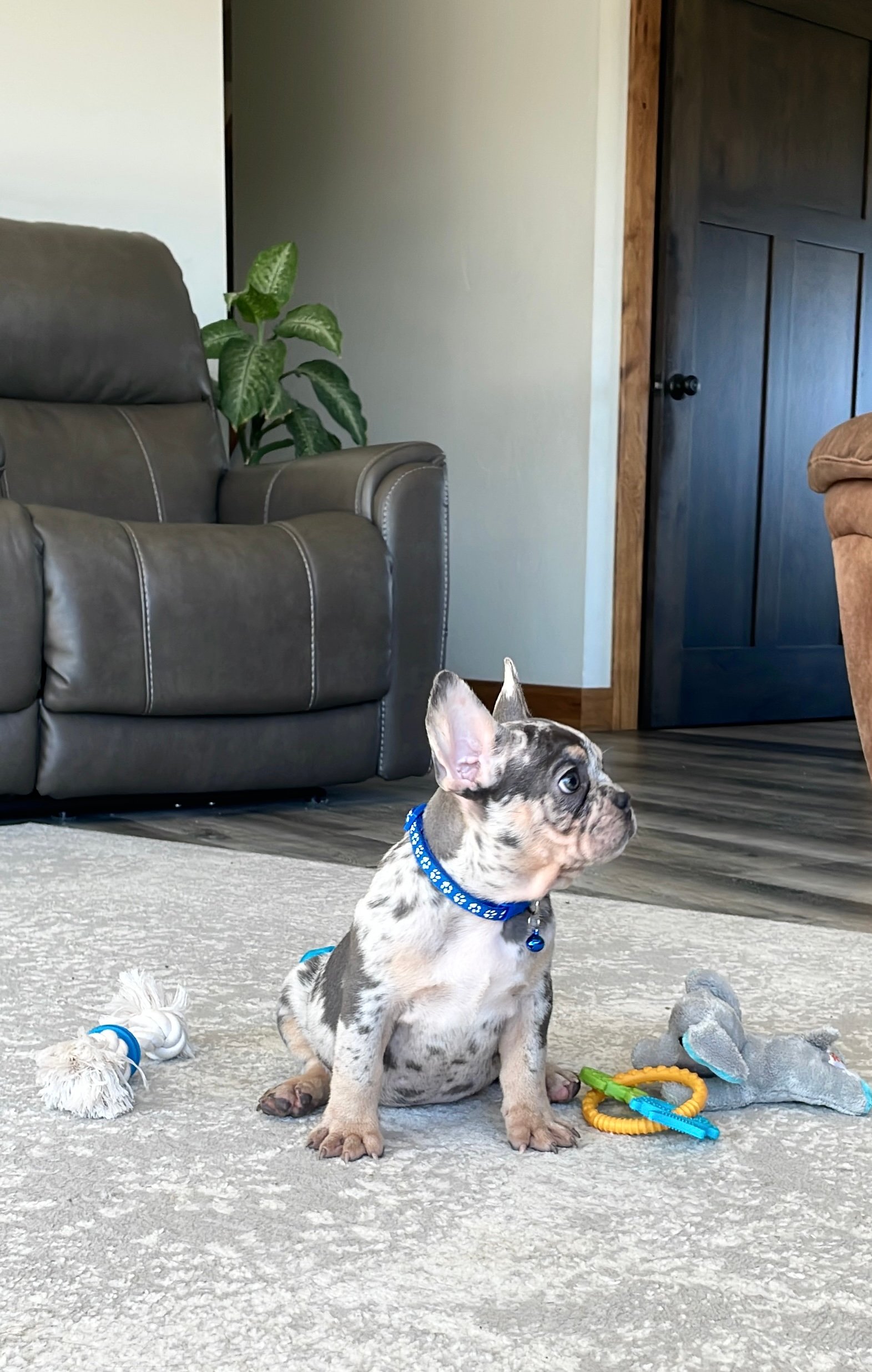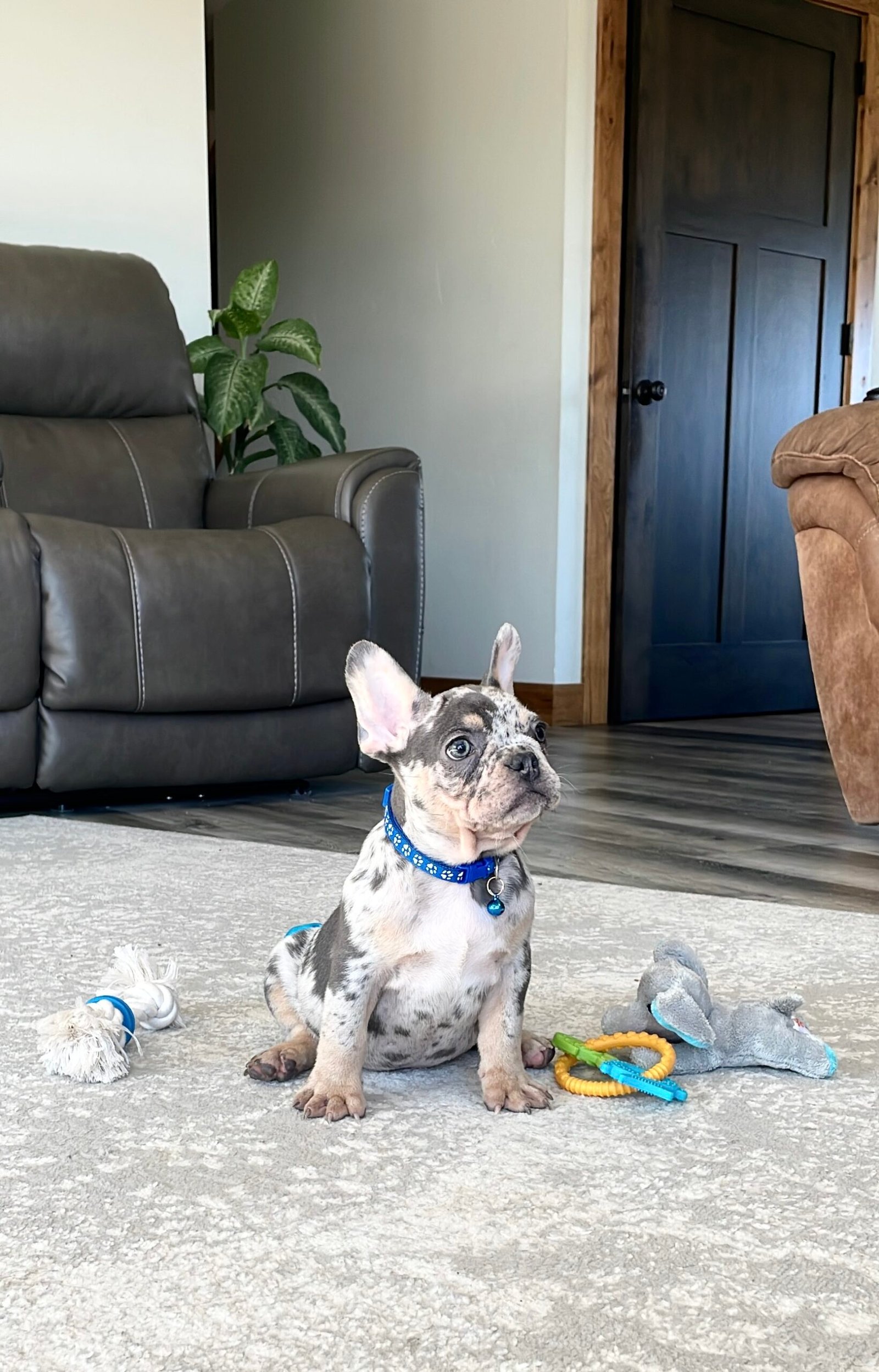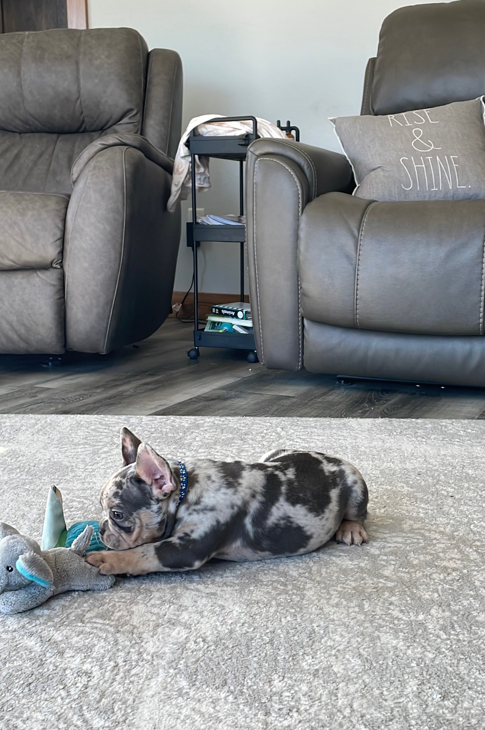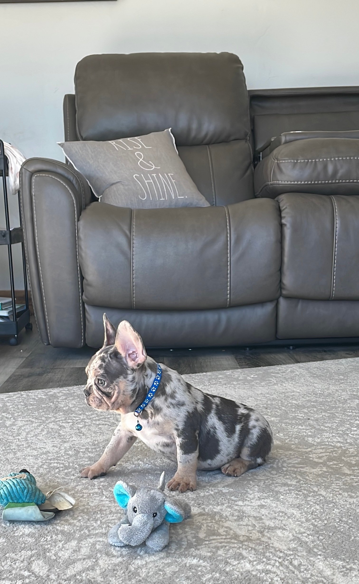 Aker is a stunning blue merle AKC French Bulldog puppy. His friendly and affectionate nature makes him the perfect companion, especially for families with children. He exudes joy and playfulness, always happily engaging with his siblings. With an abundance of love and warmth, he is ready to bring immense happiness to his new family.