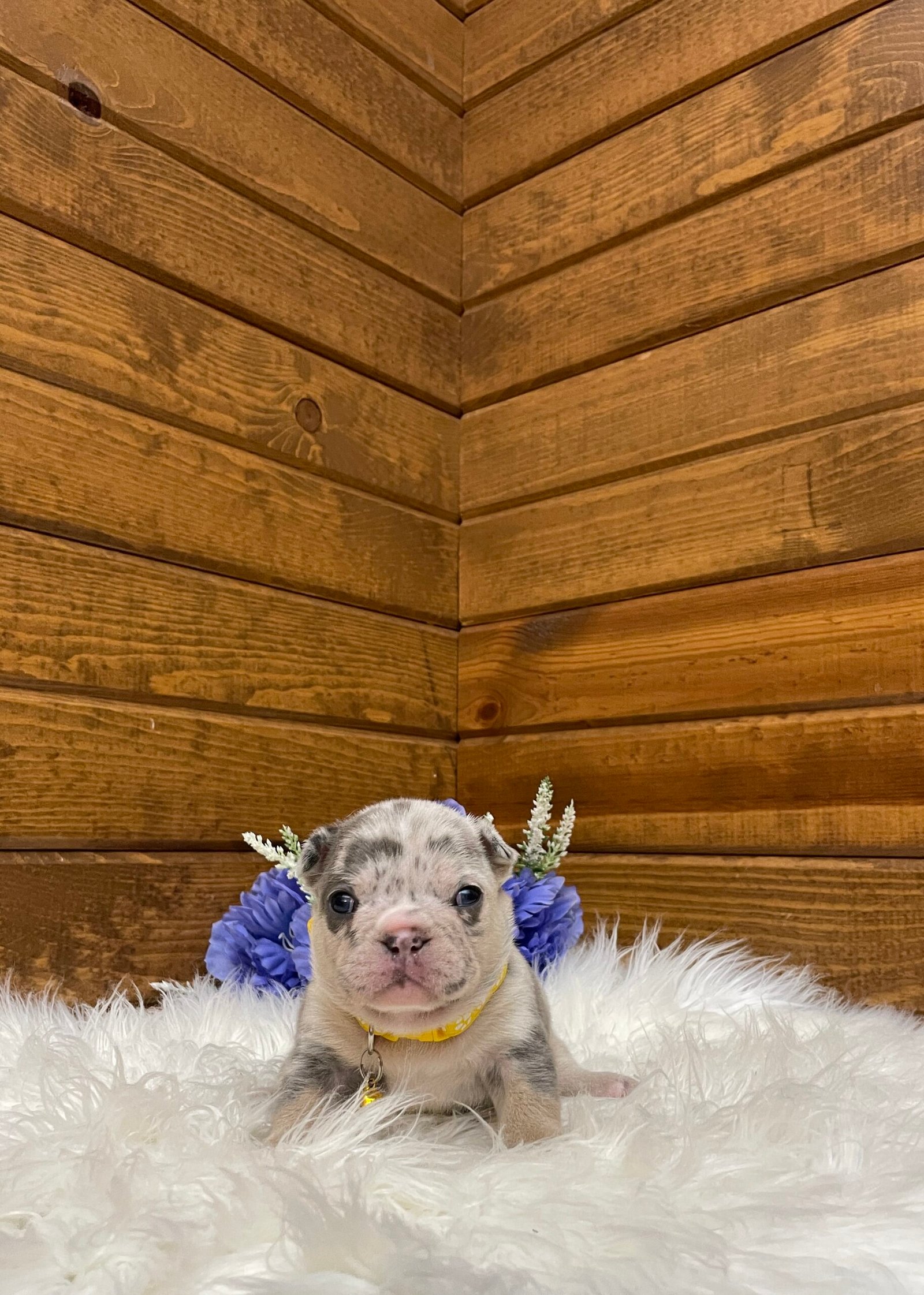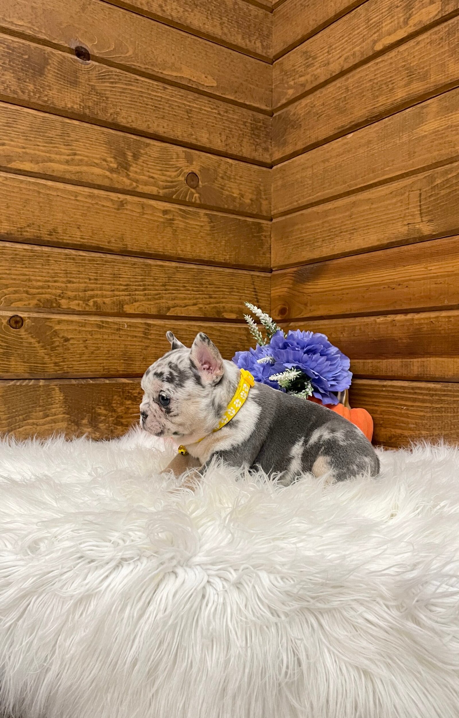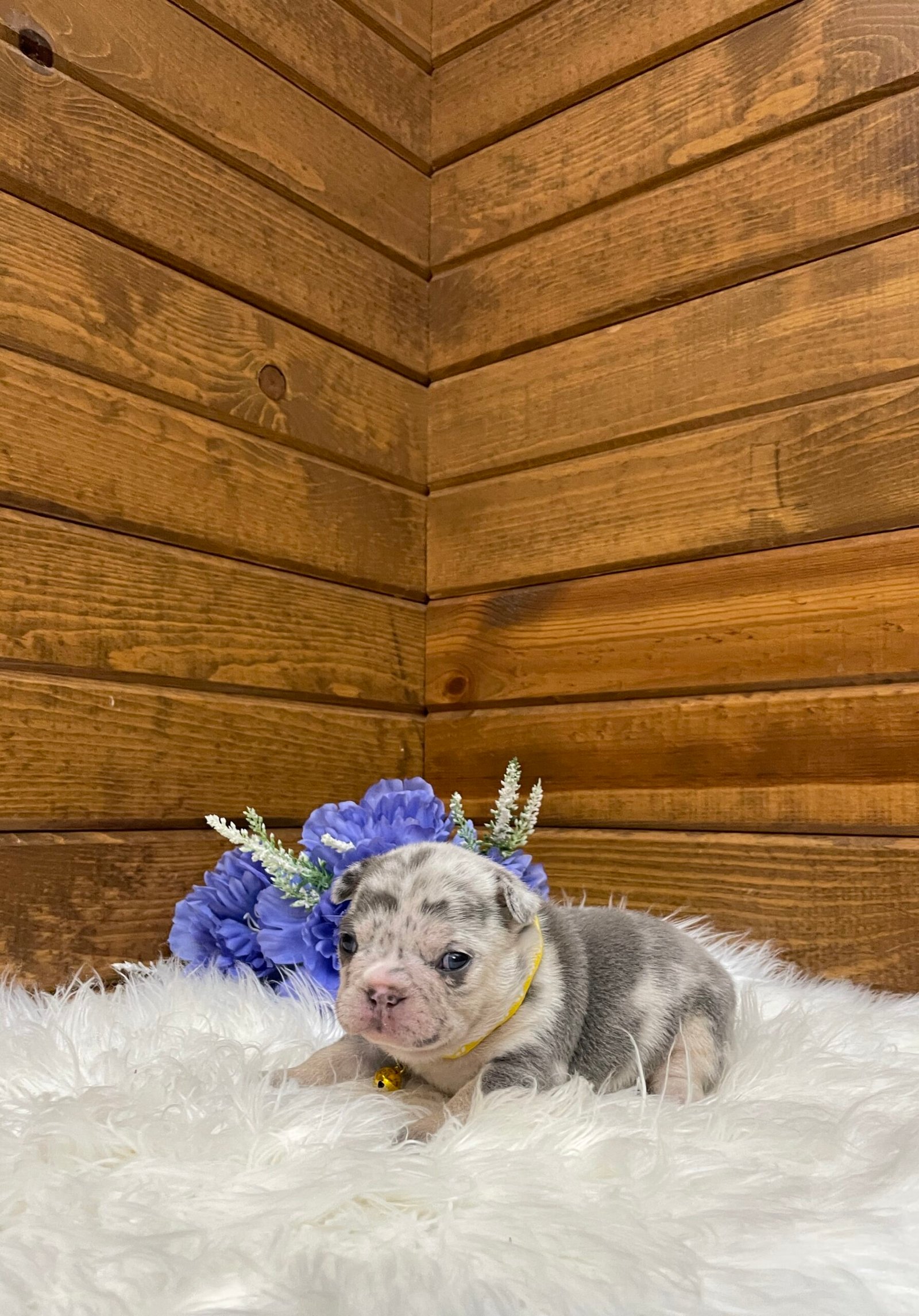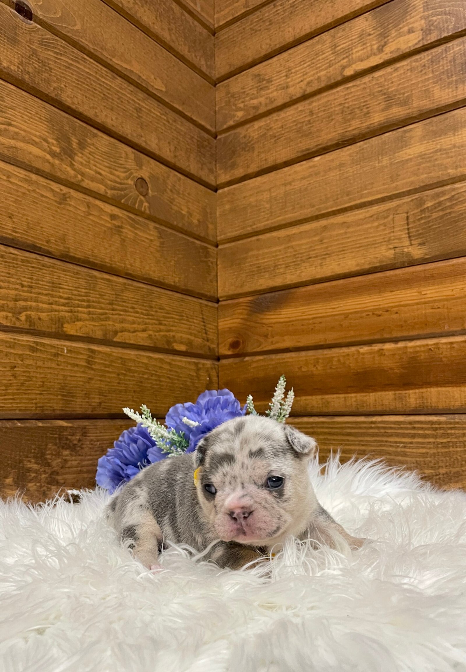 Blaze is a beautiful and stocky blue Merle French bulldog puppy.